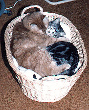 This is a picture of Sunny and Tribble curled up together, before I got the other 2 cats and they decided they didn't like each other. Aren't they cute? |