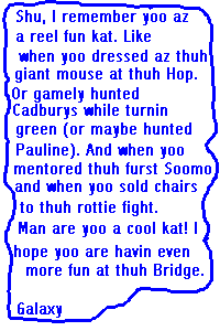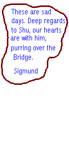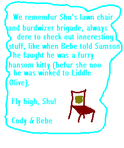 Our gud friend Shu, the OCC vice-president, had to go to the Rainbow Bridge in Apurril 1997. All the cats in rpcc and the Orange Cats Club miss him furry much. Here we have constructed a wall, which will be full of tributes to our pal, the bean-counter, cheese begger, entertainment meister extrordinaire who was known to appear dressed as a giant mouse. Sum of the tributes were taken from the posts in rpc and rpcc, we hope you kitties don't mind.