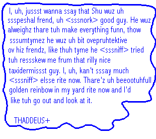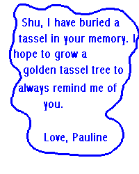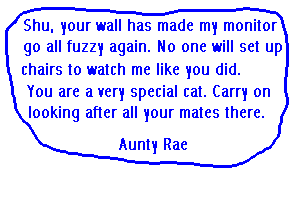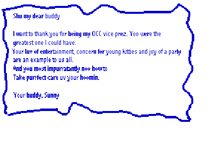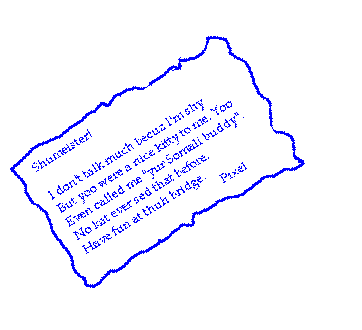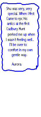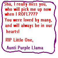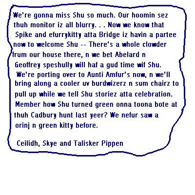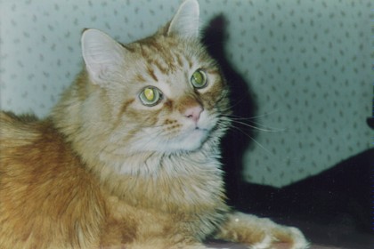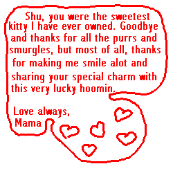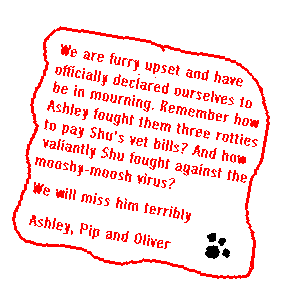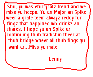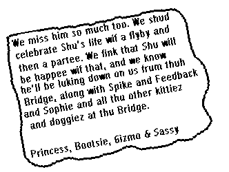 Our gud friend Shu, the OCC vice-president, had to go to the Rainbow Bridge in Apurril 1997. All the cats in rpcc and the Orange Cats Club miss him furry much. Here we have constructed a wall, which will be full of tributes to our pal, the bean-counter, cheese begger, entertainment meister extrordinaire who was known to appear dressed as a giant mouse. Sum of the tributes were taken from the posts in rpc and rpcc, we hope you kitties don't mind.